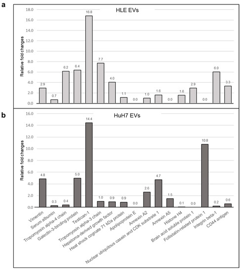 Some of our most noteworthy results were obtained when hepatoma cell lines were exposed to LX2-derived EVs and then allowed to produce their own treatment-modulated EVs. The abundance of more than 100 proteins was analyzed by quantitative mass spectrometry to assess the effect of LX2 EV treatment on the protein composition of hepatoma-derived EVs. Among the proteins with increased EV abundance, we identified SPOCK1/testican-1, a proteoglycan increasingly accepted as oncogenic [32,33,34] that displayed over 10-fold elevation in the treatment-modulated EVs of both hepatoma cell lines. High expression of testican-1 was demonstrated in hepatocellular carcinomas, particularly in those associated with hepatitis C virus (HCV) [35], and in serous ovarian cancer [36], where testican-1 was also detectable in the sera of cancer patients. Future research should clarify the role of testican-laden circulating EVs in cancer patients.