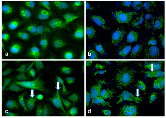Morphology and SPOCK1/testican-1 immunostaining of hepatoma cells before (a,b) and after (c,d) treatment with LX2-derived EVs. (a,c): HLE and (b,d): HuH7. Green: testican-1 and blue: DAPI. Control hepatoma cells ((a), HLE and (b), HuH7) exhibited cytoplasmic testican-1 positivity. Upon exposure to LX2 EVs, these hepatoma cells underwent phenotypic changes and modifications in EV cargo. Their cytoplasm increased and elongation occurred while a small subset of HLE cells displayed intranuclear testican-1 positivity (arrows). Original magnification: 40×.