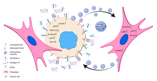 Overview of multiple levels of cancer cell–fibroblast communication. We investigated the communication between poorly and well-differentiated hepatoma cells and LX2 immortalized fibroblasts via soluble factors, metabolites, EVs, and miRNAs. LX2 fibroblasts, when co-cultured with HLE cells, exhibited increased production of laminin β1, type IV collagen, CD44, and shedding of syndecan-1, whereas the dominant matrix components in the HuH7/LX2 co-culture system included type IV collagen and cell surface syndecan-1. Hepatoma-derived EVs influenced the MAPK and Wnt signaling pathways in LX2 cells. LX2-derived EVs induced significant upregulation of testican-1 in the EV cargo of hepatoma cells. Hepatoma-derived EVs carried miRNAs that were differentially regulated upon interaction with LX2, could impact tumor progression, and may serve as diagnostic markers. Created with BioRender.com.