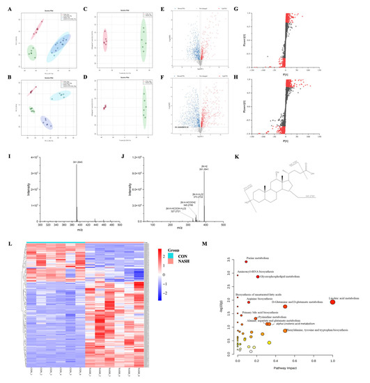 Effects of LPJZ-658 on serum metabonomic profiling by LC-MS. PCA score plots of the CON group, LPJZ-658 group, NASH group and NASH + LPJZ-658 group based on the data acquired from 50% methanol in water extracts ((A) ESI+ and (B) ESI−). OPLS-DA score plots/Volcano plots/S-plot of CON group and NASH group based on the data acquired from 50% methanol in water extracts ((C,E,G), ESI+, and (D,F,H), ESI−). Mass spectra of the deoxycholic acid (DCA) at RT 9.20 min m/z 391.2840, full scan mass spectrum (I), tandem mass spectrum (J), and structural formula (K). (L) Heatmap and hierarchical cluster analysis of differential metabolites between the CON group and NASH group. (M) The pathway analysis visualized by bubbles plot.