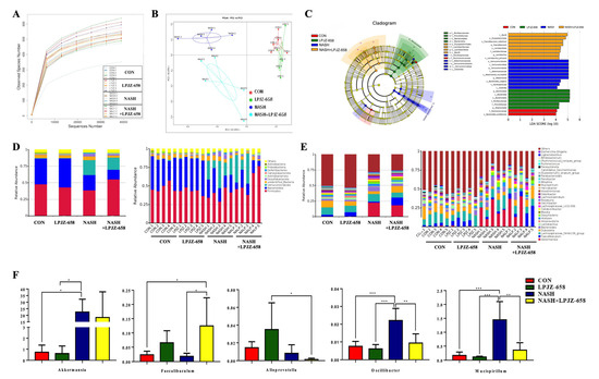 Alterations in BA metabolism profiles are closely related to gut bacteria changes. Thus, fecal microbiota compositions were examined by 16S rRNA gene sequencing to assess the effects of LPJZ-658 supplementation on the gut bacteria of NASH mice. As shown in Figure 5A, the rarefaction curve of each feces sample tended to be flat, suggesting a credible sequencing result.