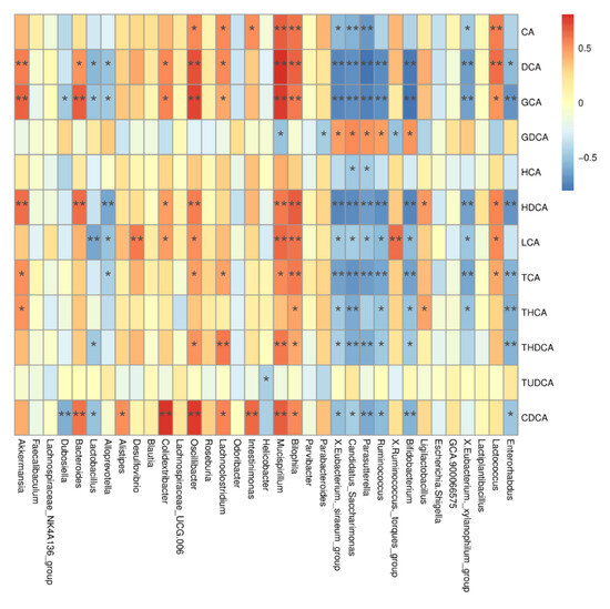 Correlation between differential BAs and differential gut microbiota. CA, cholic acid; DCA, deoxycholic acid; GCA, glycocholic acid; GDCA, glycodeoxycholic acid; HCA, hyocholic acid; HDCA, hyodeoxycholic acid; LCA, lithocholic acid; TCA, taurocholic acid; THCA, taurohyocholic acid; THDCA, taurohyodeoxycholic acid; TUDCA, tauroursodeoxycholic acid; CDCA, chenodeoxycholic acid. Data presented indicate the mean ± SEM (* p < 0.05 and ** p < 0.01).