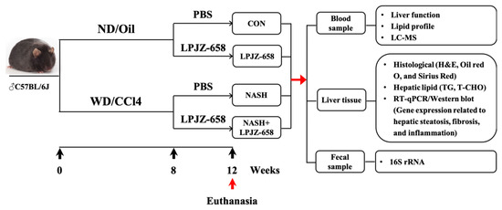 Eight- to ten-week-old male C57BL/6J mice were purchased from Jilin Genet-Med Biotechnology Co., Ltd. (Jilin, China) and maintained in a 12 h light/dark cycle environment. All mice were randomly divided into four groups after 1 week of acclimation: a control (CON) group, LPJZ-658 group, NASH group, and NASH + LPJZ-658 group for 12 weeks. The CON group and LPJZ-658 group were fed a normal chow diet (ND) (AIN-93G, Xiao Shu You Tai [Beijing] Biotechnology Co., Ltd., Beijing, China) and normal tap sterilized water. The NASH group and NASH + LPJZ-658 group were fed a Western Diet (WD) [71] (Xiaoshuyoutai [Beijing] Biotechnology Co., Ltd., Beijing, China) and a high sugar solution (18.9 g/L glucose and 23.1 g/L fructose [Sigma-Aldrich, Louis, MO, USA]). The CON group and LPJZ-658 group were injected intra-peritoneally (I.P.) with corn oil, whereas the NASH group and NASH + LPJZ-658 group were injected I.P. with carbon tetrachloride (CCl4, Shanghai Titan Scientific Co., Ltd., Shanghai, China) at a dose of 0.32 μg/g of body weight once/week, respectively. In addition, the LPJZ-658 and NASH + LPJZ-658 groups were administered oral gavage daily with 1 × 109 CFU/day per mouse in the last 4 weeks of the experiment.