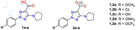 The selected molecules were 2-(4-methoxyphenyl)-5-(pyrrolidin-1-yl)-2H-1,2,3-triazole-4-carboxylic acid (molecule 1a) and its anion form (molecule 2a), Figure 1. These molecules can have special properties due to the liposolubility of the structure provided by the aromatic ring that facilitates cell membrane penetration, and its hydrosolubility provided by the carboxylic group or its anionic form. In addition to these compounds, several derivatives (1c–e and 2c–e) with electron-donating group in the para-position at the aryl ring were also optimized. Therefore, the effect of the substituent electronic nature on the structural parameters of the triazole ring was evaluated, which will be useful for further designing new compounds with improved biological activity.