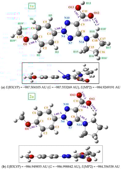 Labeling of the atoms and plot of the structure of: (a) 2-(4-methoxyphenyl)-5-(pyrrolidin-1-yl)-2H-1,2,3-triazole-4-carboxylic acid (in short 1a). (b) 2-(4-methoxyphenyl)-5-(pyrrolidin-1-yl)-2H-1,2,3-triazole-4-carboxylate anion (in short 2a), with front and lateral view forms. Several bond lengths and intramolecular H-bond values of interest calculated at the MP2/6-31G(d,p) level are included in the figure. The total energy of the system (E) including zero-point correction, the Gibbs free energy (G) with the B3LYP method and the total energy by MP2 are also included. 1 AU = 2625.5 kJ/mol.