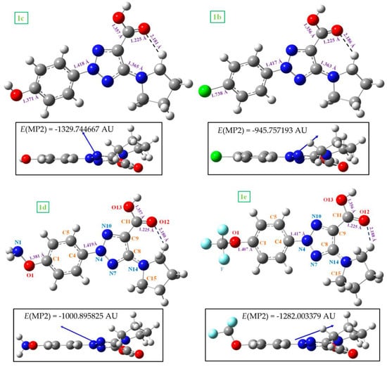 Two views of the optimized structure in the neutral form of 1b (with chlorine substitution), 1c (with hydroxyl substitution), 1d (with the oxo-amino group), and 1e (with the oxo-trifluoromethyl group). The MP2 energy value was included at the bottom of each figure. The blue arrow corresponds to the dipole moment vector.