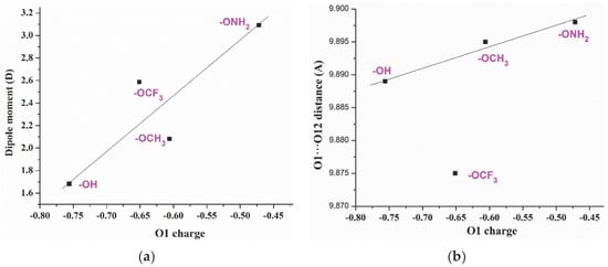 Several relationships were established between the optimized geometric parameters and electronic characteristics of the five acids 1a–e shown in Figure 1. The different para-substituents on the aryl ring leads to a noticeable change in the negative NBO natural atomic charge of O1 oxygen, which is larger in compound 1c (R = OH), and lower in compound 1d (R = ONH2), Table 2. The lowest value corresponds compound 1b with the chlorine substituent bonded to the aromatic ring. With the exception of acid 1b, their values appear linear related to the dipole moment of the molecule, Figure 4a. A decrease in the negative charge on O1 leads to an increment in the dipole moment, as is expected due to the large negative charge of the other side of the molecule with the -COOH group. The direction of the dipole moment vector differs in 1b (R = CL) and 1e (R = OCF3) due to the lack of O1 in 1b and the three fluorine atoms in 1e.