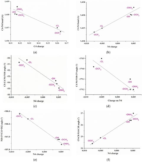 A change in the negative charge on O1 with the different para-substituents on the aryl ring leads to a change in the positive charge on the C1 bonded atom. The exception is 1b with a negative charge on C1 due to there being a chlorine atom instead of O1. This feature leads to a redistribution of the aryl group charge, which affects its aromaticity and the positive charge value on C4. An increment in its positive value appears linear related to a shortening of the C4−N4 bond length, Figure 5a. Although this change in 1b (R = CL) and 1e (R = OCF3) looks small, it is enough to give rises to a decrease of 4º in the rotation of the aryl ring plane related to the triazole ring plane, which can be measured through the C5-C4-N4-N10 torsional angle. This decrease is lower in the anionic forms.
