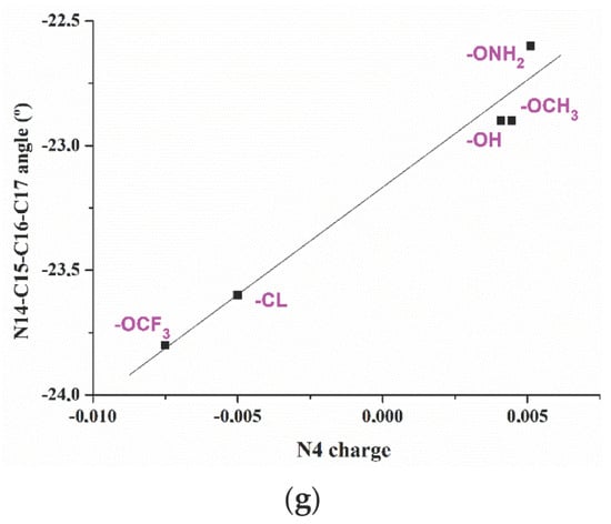 Relationships established between the atomic charges on C4 and N4 with the geometric parameters involved in the triazole ring structure. (a) Relationship between the C4-N4 bond length and the NBO atomic charge on C4. (b) Relationship between the C4-N4 bond length and the NBO atomic charge on N4. (c–g) Relationship between several torsional angles and the NBO atomic charge on N4.