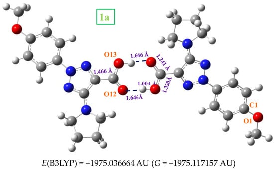In the solid state, 1a is expected to be symmetrically H-bonded in a cyclic dimer form through the –COOH group as in related molecules with the carboxylic group []. Thus, its dimeric structure was optimized and plotted in Figure 6. This optimized dimer form predicted for the crystal unit cell was confirmed by comparison of the carboxylic vibrations of their IR and Raman spectra with those obtained experimentally in the solid-state sample. Both molecules of the dimer are almost planar, and they are H-bonded with the same bond length, 1.646 Å by B3LYP. This H-bond value is slightly longer than that reported in the benzoic acid (BA) dimer, 1.616 Ǻ [], which can be explained by the slight decrease in the negative charge on =O12 in 1a as compared to BA. A longer C=O bond (1.241 Ǻ vs. 1.237 Ǻ in BA) and, consequently, a shorter C9-C11 bond length (1.466 Ǻ vs. 1.487 Ǻ in BA) is calculated. As expected, a lengthening of the acceptor C=O bond (1.225 Å in monomer vs. 1.241 Å in dimer) and a shortening of the donor C-OH bond (1.357 Å in monomer vs. 1.320 Å in dimer) is observed on dimer H-bond formation. This shortening in the C-OH bond is proportional to the intermolecular H-bond length [].