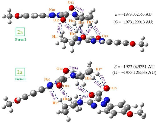 The interaction energies were calculated in 1a and 2a dimers. Its calculation is described in detail in the Supplementary Materials Section. The deformation energy Edef in the 1a dimers, 18.6 kJ/mol, is slightly lower than in the most stable form of 2a, 21.8 kJ/mol. This can be due to the stacking interaction, which, although weak in the 2a dimer, affects a larger number of atoms than in the 1a dimer. This deformation energy has a similar value in the I and II forms of 2a. The CP corrected interaction energy of the is −82.8 kJ/mol in 1a, in accordance with that reported in the cyclic dimer of benzoic acid, −81.7 kJ/mol [].