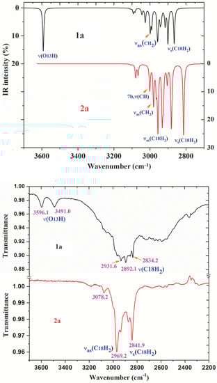 A comparison of the whole FTIR experimental spectra of 1a and 2a with those corresponding to the theoretical scaled spectra by the PSE procedure in the monomer form were plotted in Figure S2, while the comparison with the Raman values is shown in Figure S3. For a better analysis and comparison of the different experimental and scaled vibrational wavenumbers of these figures, the spectra are divided into three regions, such as: 3700–2700 cm−1, 1800–1000 cm−1 and 1000–0 cm−1 (or 1000–600 cm−1). The IR spectra of these figures are shown in Figure 8, Figure 9 and Figure 10, while for simplicity, the Raman spectra are included as Supplementary Materials, Figures S4–S6. The assignment of the most intense and characteristic IR wavenumbers is included in these figures.