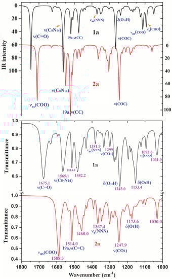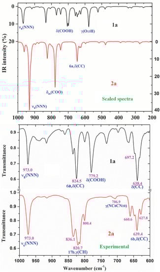 The C-O13 modes: The displacement vectors correspond to the COO group instead of an isolated C-O bond and is therefore characterized as νas(COO) in Table 5. In the monomer form, its stretching mode appeared scaled with strong IR intensity at 1113 cm−1 and it could be related to the experimental bands at 1122.5 cm−1 (IR) and 1120.6 cm−1 (Raman). In the dimer form, they were predicted with very weak IR and Raman intensities, and therefore they were not detected in the spectra. This stretching mode in 1a appears noticeable coupled with νs(NNN) and δ(C-H) modes, and thus, their experimental wavenumbers differ from those assigned to this mode in BA at 1347 cm−1 (IR) [,].