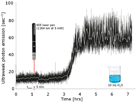 Figure 1. Laser-induced chain reaction in water. A 5 min exposure of air-saturated bidistilled water to low-intensity laser (5 mW) infrared radiation (with 1264 nm) induces, after a long latent period, luminescence in the blue-green region that last many hours. The pumping activity is triggered as the laser wavelength corresponding to the wavelength of the electronic transition of dissolved oxygen inducing a transition from the triplet state into the singlet state (compiled and adapted from [47]).