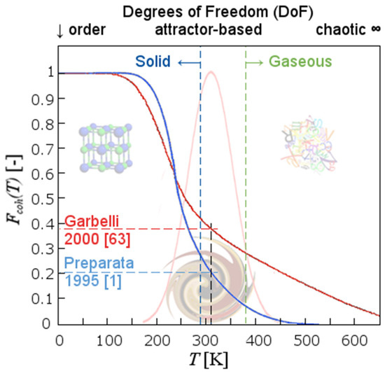 Figure 3. Calculated trend of the “coherent fraction” FCoh(T) vs. temperature. Water at sub-zero temperatures becomes almost fully coherent, FCoh(T) ≈ 1, thus ordered (few degrees of freedom (DoFs), whereas water in the vapor phase asymptotically approaches FCoh(T) = 0 (DoFs approach an infinitely large number). The original calculations showed that at physiological temperatures (310 K) the coherent fraction is 20% (dashed blue line) [1]. A revision and finetuning of the relevant parameters involved revealed that the coherent fraction in warm-blooded animals amounts to even 40% (dashed red line) [63]. In this context, it was also found that coherent elements can still be found even at temperatures > 600 K. The optimal viable window, however, where most organisms thrive, as highlighted by the cub-imposed Gaussian distribution, is found in-between the solid and the gaseous states (with limited DoFs, embraced by the dashed blue and dashed green line).
