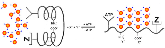 Figure 4. Schematic illustration of how binding and adsorption of ATP along with its “helpers” (congruous anions and protein X, shown as Z) unravels the “folded” secondary structure (left). Selective K+ adsorption on the liberated β, and γ carboxyl groups occurs, triggering multilayer water polarization on the exposed backbone NHCO groups characterizing the resting state of the protein (right) (modified after [66,68]).