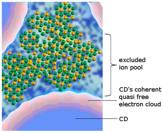 Figure 5. Sketch showing the state of dissolved ions in liquid water according to QED theory. The coherent, non-ideal Debye–Hückel plasmas located in the non-coherent fraction of water explain how such a stable system—like the ionic crystal—can dissolve and why with the increase in temperature increases the solubility of many ionic species.