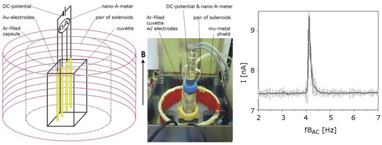 Figure 6. An example of the experimental setup for the realization of the Zhadin effect. Left: cell scheme; center: photo of the real setup; right: current peak in glutamic acid solution (in 2.24 mM HCl, pH = 2.85); resonance peak occurred at 4.2 Hz obtained with a static (Bdc = 40 μT) and alternate magnetic field amplitude (Bac = 50 nT). Applied electric potential between electrodes: 80 mV. Figure adapted and modified after Pazur [88].