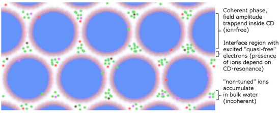 Experimental evidence [32,33,34,35] and descriptive approaches [36] have demonstrated that liquid water must be a two-phase system. According to QED [1], part of the molecules in such a system (whose abundance is in “inverse proportion” to the temperature) are organized in collective, coherent vibrational domains corresponding approximately to the size of a wavelength of the coupled electromagnetic mode. Their energy range corresponds to the spectral distance between the two energy levels at which the electron of each water molecule oscillates. Such regions are called coherence domains (CDs), and, in liquid water, where coherence is established between the sp3 and 5d levels, their size is ideally the wavelength of the corresponding electromagnetic mode (photon), about 100 nm (neglecting thermal fluctuations, which correspond to a frequency of the field in vacuum of 3 PHz, which, during the coupling with the matter field given by the resonating molecules, will be renormalized down to the IR range, about 6 × 1013 Hz). At non-zero Kelvin temperature, its size is reduced by thermal noise, which detunes some of the molecules, generating an incoherent vaporous “halo” around the coherent domain [31,37].