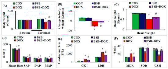 Effect of BSB on body weight (A), change in body weight (B), heart weight (C), hemodynamics (D), cardiac diagnostic markers (E), and oxidative stress markers (F). Each column is mean ± SD for eight rats in each group; columns not sharing a common symbol (*, #) differ significantly from each other (* p < 0.05 vs. normal control, # p < 0.05 vs. DOX control). CON: Normal control rats; BSB: α-Bisabolol-alone treated rats; DOX: DOX-alone treated rats; BSB + DOX: α-Bisabolol-and-DOX-treated rats. * Units: µM/mL for MDA and GSH; U/mL for SOD.