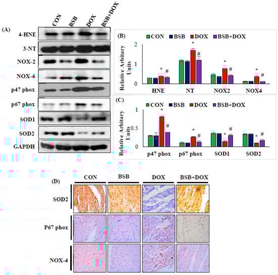 Immunoblotting of oxidative stress markers (A), densitometric analysis and changes in expression of HNE, 3-NT, NOX2 and 4, p47 phox, p67 phox, SOD1 and 2 (B,C), immunohistochemical analysis of SOD2, p67 phox and NOX4, magnification (40×) (D). Columns not sharing a common symbol (*, #) differ significantly from each other (* p < 0.05 vs. normal control, # p < 0.05 vs. DOX control). Immunoblotting and immunohistochemical analysis were performed in duplicates. CON: Normal control rats; BSB: α-Bisabolol-alone-treated rats; DOX: DOX-alone-treated rats; BSB + DOX: α-Bisabolol-and-DOX-treated-rats.