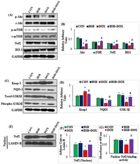 Western immunoblot analysis for Akt, mTOR, Nrf2, and HO-1 (A), densitometric analysis and relative changes in the expressions of Akt, mTOR, Nrf2, and HO-1 (B), Western immunoblot analysis for Keap1, NQO1, and GSK-3β signaling proteins (C), densitometric analysis and relative changes in the expressions of Keap1, NQO1, and GSK-3β proteins (D). Western immunoblot and densitometric analysis of Nrf2 in nuclear fraction depict nuclear translocation (E,F). Nuclear Nrf2 binding activity in different experimental groups (G). Each column is mean ± SD for eight rats in each group; columns not sharing a common symbol (*, #) differ significantly from each other (* p < 0.05 vs. normal control, # p < 0.05 vs. DOX control). CON: Normal control rats; BSB: α-Bisabolol-alone-treated rats; DOX: DOX-alone-treated rats; BSB + DOX: α-Bisabolol-and-DOX-treated rats.