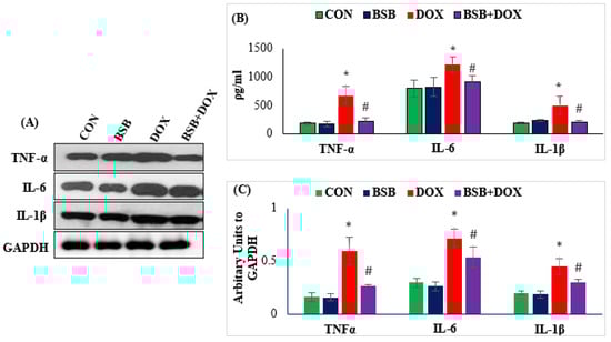 The levels of TNF-α, IL-6, and IL-1β in the myocardium (A), Western immunoblot analysis showing myocardial expression of TNF-α, IL-6, and IL-1β (B), densitometric analysis and relative changes in the expression of TNF-α, IL-6, and IL-1β (C). Each column is mean ± SD for eight rats in each group; columns not sharing a common symbol (*, #) differ significantly from each other (* p < 0.05 vs. normal control, # p < 0.05 vs. DOX control). Immunoblotting analysis was performed in duplicates. CON: Normal control rats; BSB: α-Bisabolol-alone-treated rats; DOX: DOX-alone-treated rats; BSB + DOX: α-Bisabolol-and-DOX-treated rats.