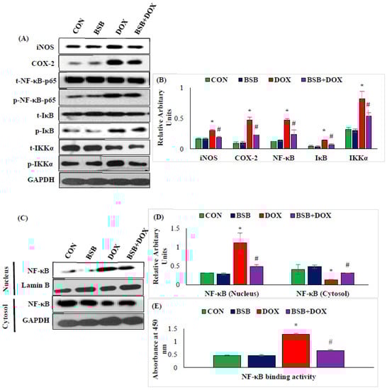 Western immunoblotting for iNOS, COX-2, NF-κB-p65, p-NF-κBp65, IκBα, p-IκBα, t-IKKα, and p-IKKα (A), relative changes in the expression of iNOS, COX-2, NF-κB, IκBα, and IKKα (B), Western immunoblotting analysis representing nuclear translocation of NF-κB (C), densitometric analysis and relative changes in the expression of NF-κB in nucleus and cytosol (D), NF-κB binding activity (E). Columns not sharing a common symbol (*, #) differ significantly from each other (* p < 0.05 vs. normal control, # p < 0.05 vs. DOX control). Immunoblotting analysis was performed in duplicates. CON: Normal control rats; BSB: α-Bisabolol-alone-treated rats; DOX: DOX-alone-treated rats; BSB + DOX: α-Bisabolol-and-DOX-treated rats.