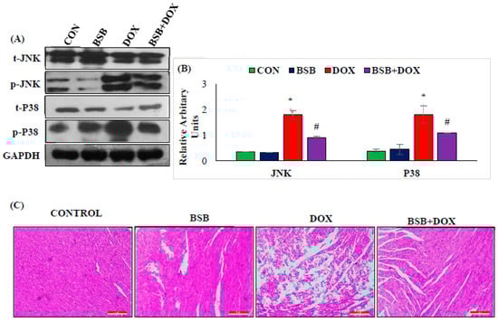 Immunoblotting analysis of t-JNK, p-JNK, P38, and p-P38 (A), densitometric analysis and relative changes in the expression of JNK and P38 (B). Columns not sharing a common symbol (*, #) differ significantly from each other (* p < 0.05 vs. normal control, # p < 0.05 vs. DOX control). The histopathology of the myocardium (10×) (C). Normal control rat’s heart revealed a regular architecture of the myocardium; BSB-alone-treated rat’s heart also showed normal intact muscle fibers without any pathological changes; DOX-administered rat’s heart showed extensive muscle fiber degradation with inflammatory cells; BSB-treated DOX-injected rats showed reduced muscle fiber degradation without inflammatory cells. Histological analysis was performed in duplicate. CON: Normal control rats; BSB: α-Bisabolol-alone-treated rats; DOX: DOX-alone-treated rats; BSB + DOX: α-Bisabolol-and-DOX-treated rats.