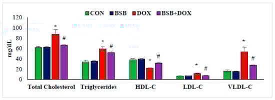 The levels of lipids in the serum. Each column is mean ± SD for eight rats in each group; columns not sharing a common symbol (*, #) differ significantly from each other (* p < 0.05 vs. normal control, # p < 0.05 vs. DOX control). CON: Normal control rats; BSB: α-Bisabolol-alone-treated rats; DOX: DOX-alone-treated rats; BSB + DOX: α-Bisabolol-and-DOX-treated rats.