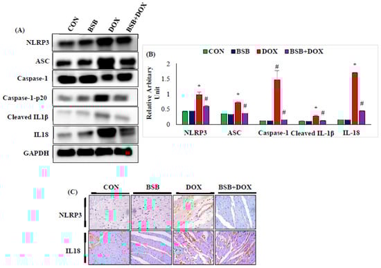 Immunoblotting and densitometric analysis of pyroptosis marker proteins, NLRP3, ASC, caspase-1, caspase-1-p20, cleaved IL-1β, and IL-18 (A), relative changes in the expression of NLRP3, ASC, caspase-1, caspase-1-p20, cleaved IL-1β, and IL-18 (B), immunohistochemistry of NLRP3 and IL-18, magnification (40×) (C). Columns not sharing a common symbol (*, #) differ significantly from each other (* p < 0.05 vs. normal control, # p < 0.05 vs. DOX control). Immunoblotting and immunohistochemical analysis were performed in duplicate. CON: Normal control rats; BSB: α-Bisabolol-alone-treated rats; DOX: DOX-alone-treated rats; BSB + DOX: α-Bisabolol-and-DOX-treated rats.