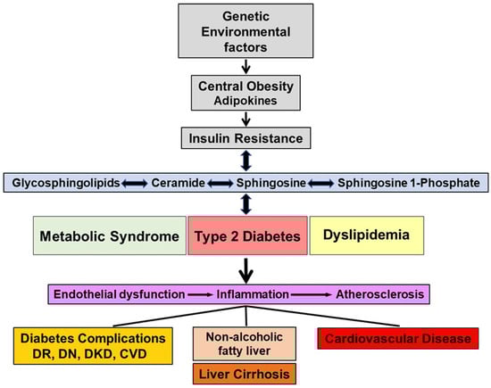 Schematic representation of the series of events mediated by sphingolipids; linking obesity to type 2 diabetes, dyslipidemia and metabolic syndrome; their contribution to endothelial dysfunction, inflammation and atherosclerosis; and the resulting complications including cardiovascular disease, diabetic kidney disease, retinopathy, neuropathy and non-alcoholic fatty liver disease/liver cirrhosis. Changes in sphingolipids can either contribute to, or result from, insulin resistance, dyslipidemia, metabolic syndrome and type 2 diabetes. DR, diabetic retinopathy; DN, diabetic neuropathy; DKD, diabetic kidney disease; CVD, cardiovascular disease.