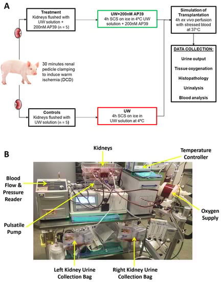 Following nephrectomy, the donor kidneys were randomly assigned to the UW group (n = 5) or UW+AP39 group (n = 5). To mimic the clinical version of SCS, which is the current clinical standard of care for organ graft preservation, paired renal grafts from each pig were flushed with and stored in UW solution (on ice at 4 °C for 4 h with or without AP39 (200 nM)). The UW solution contained water, lactobionic acid, potassium phosphate monobasic, magnesium sulfate heptahydrate, raffinose pentahydrate, adenosine, allopurinol, glutathione, potassium hydroxide, and sodium hydroxide, according to the manufacturer. The experimental design is illustrated in Figure 1A. AP39 was provided by Prof. Matthew Whiteman (University of Exeter Medical School, Exeter, UK), and the dose added to the UW solution was determined from our previous study [], while the UW solution was obtained from Global Transplant Solutions, Toronto, ON, Canada.