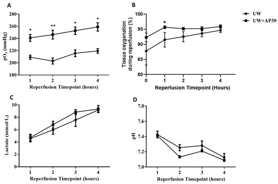 2.1. Addition of AP39 to UW Solution Improves Arterial pO2 and Tissue Oxygenation during Reperfusion