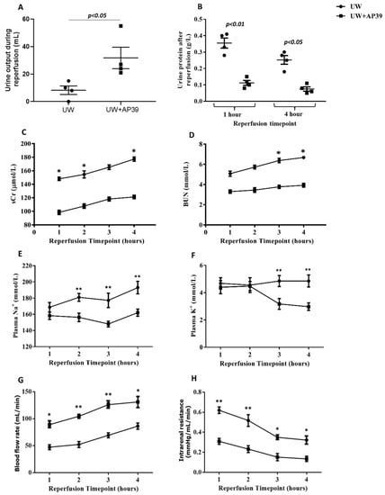 To assess the effect of AP39 on renal graft function following its addition to the UW solution, urine and blood samples were collected hourly during reperfusion, and parameters of renal function were measured. The addition of AP39 to the UW solution resulted in a marked increase in urine production compared to the volume of urine produced by the control kidneys without AP39 supplementation (Figure 3A; p < 0.05). Since renal graft preservation by static cold storage at 4 °C on ice did not allow for urine collection, urine samples were collected at the 1 h and 4 h timepoints, during reperfusion and urine protein was analyzed between both groups. While urine protein from kidneys of both groups slightly decreased from the 1 h to the 4 h timepoint, urine protein in the UW+AP39 group significantly decreased by over three-fold at the 1 h timepoint compared to that in the UW-only group (Figure 3B; p < 0.01), with a similar trend at the 4 h timepoint (Figure 3B; p < 0.05). Also, the levels of serum creatinine and blood urea nitrogen in the UW+AP39 group reduced significantly during reperfusion compared to the UW-only group, corresponding to plasma sodium (Na+) and potassium (K+) levels (Figure 3C–F). In addition, blood flow rate in UW+AP39 group markedly increased throughout reperfusion, with a corresponding decrease in intrarenal resistance compared to the UW-only group (Figure 3G,H; p < 0.05). Thus, the addition of AP39 to the UW solution improved renal graft function, as evidenced by increased urine output and blood flow rate, and by reduced levels of urine protein, sCr, BUN, plasma Na+ and K+, as well as intrarenal resistance.