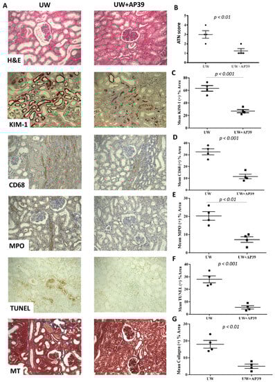 To evaluate the impact of AP39 on a renal graft injury, kidney sections from both groups were stained with H&E, KIM-1, CD68, MPO, TUNEL, and Masson’s trichrome. Renal graft morphology, as revealed by the H&E stain, showed a significantly lower acute tubular necrosis score in UW+AP39 kidneys compared to kidneys in the UW-only group (Figure 4A,B; p < 0.01). Staining with KIM-1 (kidney injury molecule-1) also showed the same trend (Figure 4A,C; p < 0.001). In addition, the influx of macrophages and neutrophils in the kidneys of the UW+AP39 group were markedly lower relative to the UW-only kidneys, as revealed by CD68 and MPO stains, respectively (Figure 4A,D,E). Furthermore, TUNEL and Masson’s trichrome stains also revealed a significant reduction in apoptosis and fibrosis, respectively in AP39-treated kidneys compared to kidneys in the UW-only group (Figure 4A,F,G). Taken together, the preservation of renal grafts in a AP39-supplemented UW solution limits graft injury during static cold storage and reperfusion.
