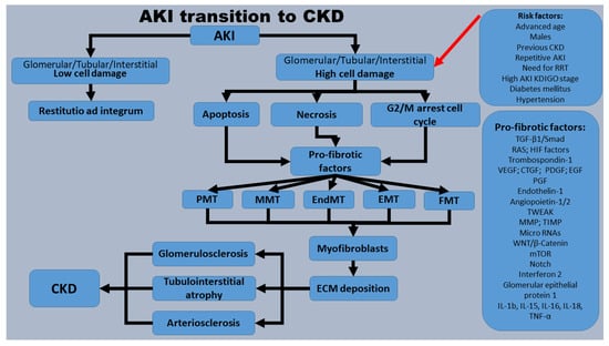 Pathogenic mechanisms involved in AKI transition to CKD. The mentioned risk factors prone AKI subjects to higher glomerular and/or tubule-interstitial system cellular damage. Furthermore, apoptotic, necrotic and senescent cells (cells blocked in the G2/M cell cycle) release and stimulate pro-fibrotic factors, which, via FMT, PMT, EMT, EndMT and MMT, will generate myofibroblasts. Myofibroblasts secrete ECM that will generate glomerulosclerosis, tubulointerstitial fibrosis and arteriosclerosis, defined as CKD. Acronyms: AKI—acute kidney injury; CKD—chronic kidney disease; CTGF—connective tissue growth factor; ECM—extracellular matrix; EGF—epidermal growth factor; EMT—epithelial to mesenchymal transition; EndMT—endothelial to mesenchymal transition; FMT—fibroblast to myofibroblast transition; HIF—hypoxia-inducible factor; KDIGO—Kidney Disease Improving Global Outcomes; IL—interleukin; MMP-7—matrix metalloproteinase-7; MMT—macrophage myofibroblast transition; mTOR—mammalian target of rapamycin; Notch—neurogenic locus notch homolog protein; PDGF—platelet-derived growth factor; PGF—placental growth factor; PMT—pericyte to myofibroblast-transition; RAS—renin-angiotensin system; RNAs—ribonucleic acids; TGF-β1—transforming growth factor; TIMP—tissue inhibitor of metalloproteinase; TNF-α—tumor necrosis factor alpha; TWEAK—TNF-like weak inducer of apoptosis; VEGF—vascular endothelial growth factor; Wnt/β-catenin—wingless/beta-catenin.