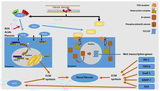 TGF-β1 and Wnt/β-catenin activation in tubular damage. ROS, acids and plasmin can induce TGF-β1 detachment from LTBP and LAP. TGF-β1 induces phosphorylation to the SMAD2/3 complex, which is translocated into the nucleus by SMAD4 and exerts pro-fibrotic transcription genes through different miRNAs. The right part of the picture represents the Wnt/β-catenin pathway. Wnt ligands bind to FZD and LPR5/6, which will induce the inactivation of the “destruction complex”, leaving β-catenin unphosphorylated. Unphosphorylated β-catenin can translocate into the nucleus, bind to TCF/LEF and, subsequently, induce Wnt-dependent pro-fibrotic gene expression. Acronyms: ECM—extracellular matrix; FZD—Frizzled receptor; LAP—latency-associated peptide; LRP5/6—lipoprotein receptor-related protein 5/6; LTBP—latent TGF-β1 binding protein; miR—micro ribonucleic acid; MMP-7—matrix metalloproteinase-7; PAI-1—plasmin activator inhibitor-1; RAS—renin-angiotensin system; ROS—reactive oxygen species; SMAD—acronym for the Caenorhabditis elegans SMA, “small” worm phenotype and MAD family, “mothers against decapentaplegic” of genes in Drosophila; Snail—gene encoded a nuclear protein similar to Drosophila embryonic protein snail; TCF/LEF—T cell factor/lymphoid enhancer factor; TGF-β—transforming growth factor beta; TRPC6—transient receptor potential canonical 6; Wnt—wingless.