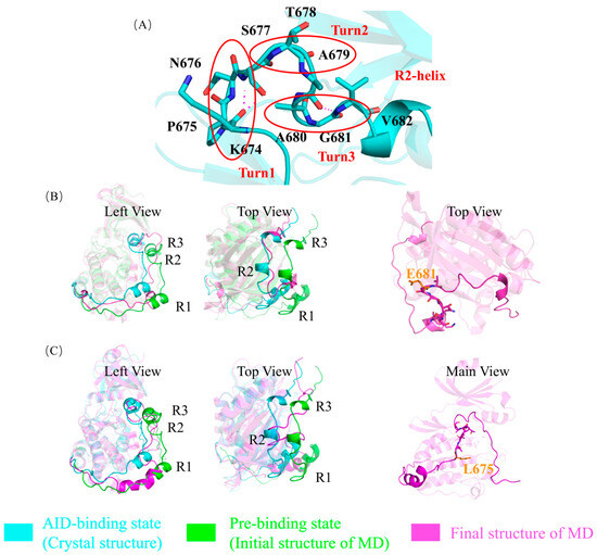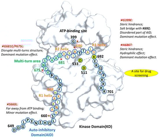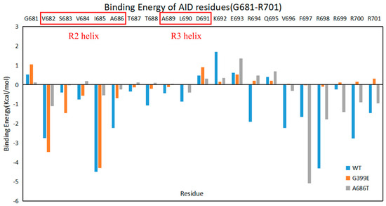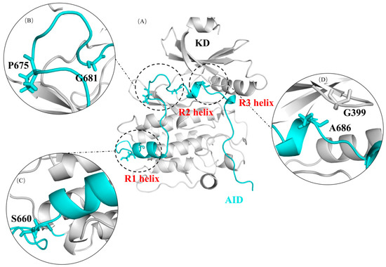 2.3. G681E and P675L Mutants Disrupt the Structural Stability of the AID