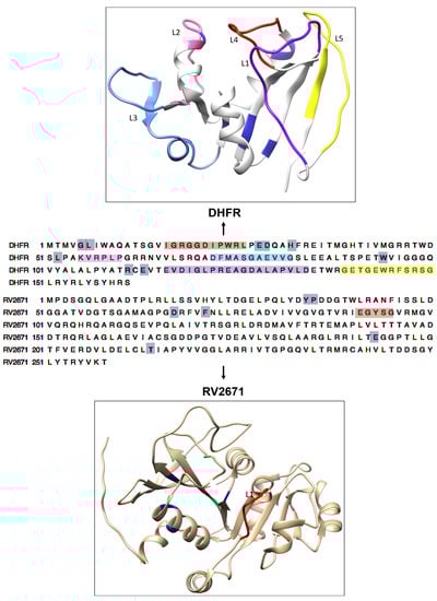 The overall structure and sequence analysis of Mtb DHFR and RV2671 enzymes. The DHFR structure above shows five loops (L1 (residues 116–134) in purple, L2 (residues 55–60) in pink, L3 (residues 72–82) in light blue, L4 (residues 16–26) in red, and L5 (residues 139–150) in yellow). The RV2671 structure below DHFR consists of a β-strand and α-helices with a characteristic L1 loop (residues 91–95: depicted in red), which is similar to the L2 loop in DHFR. Active site residues of both enzymes are shown in blue.