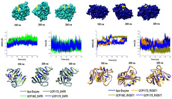 In order to determine the impact of UCP1172, UCP1175, and UCP1063’s binding on the structural stability of the DHFR and RV2671 enzymes, the root mean square deviation (RMSD) and radius of gyration (RoG) of the alpha-carbons were measured. The APO DHFR and RV2671 enzymes were used as simulated controls to differentiate any differences in the structures. The results of the RMSD and RoG analysis for the systems are shown in Figure 2.