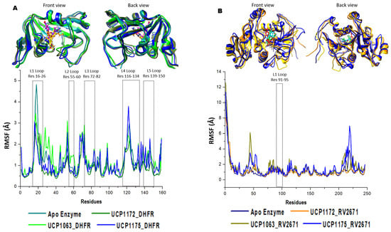 RMSF graphical analysis of the (A) UCP1172, UCP1175, and UCP1063 bound to DHFR (olive, blue, green, APO enzyme is depicted in cyan) and (B) UCP1172, UCP1175, and UCP1063 bound to RV2671 (orange, blue, dark yellow, APO enzyme is depicted in navy) complexes. Highly fluctuating residues are noted in the focused domains of the image.