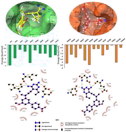Binding landscape and molecular interaction plots of the DHFR and RV2671 complexes. Graphs demonstrated the energy contributions of each active site residue to the final free-binding energy of each system.