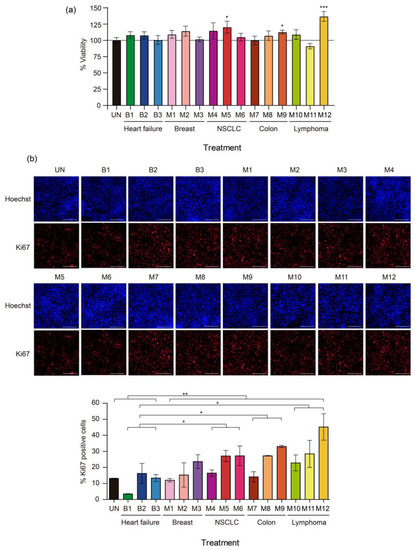 Most malignant PF samples increased the proliferation of MeT-5A cells but MeT-5A cell proliferation in the benign PF treatment groups remained similar to that in the untreated group; sample B1 was the exception among the benign PF samples, as it significantly decreased MeT-5A cell proliferation (p = 0.00057) (Figure 1b). The malignant PF samples that caused more marked increases in the percentage of Ki-67-positive cells compared to the untreated condition were M5, M6, M8, M9, M11, and M12 (204.3%, 209.1%, 206.8%, 252%, 202.1%, and 340.7%, respectively; the difference was significant for M8 (p = 0.0002)). PF samples M5, M9, and M12 also induced a non-significant increase in MeT-5A cell viability. As expected, malignant PF samples as a group significantly increased the proliferation of MeT-5A cells compared to benign PF samples (p = 0.0046). Specifically, PF samples from NSCLC (M4–M6), colorectal cancer (M7–M9), and lymphoma (M10–M12) caused significant increases in MeT-5A cell proliferation (p = 0.014, 0.015, and 0.015, respectively) compared to benign PF samples.