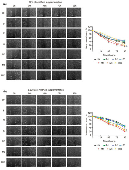 The rationale of using MeT-5A cells for migration studies is that, due to the interaction and crosstalk between tumor microenvironment and neoplastic cells, these normal mesothelial cells could potentially change their phenotypic characteristics to favor the survival and progression of malignant cells in the PF. The capacity of PF to induce changes in MeT-5A cell migration was examined with wound-healing assays. Both malignant PF and miRNA treatments induced a higher rate of cell migration than benign PF treatment or the untreated condition (Figure 2). Specifically, the degree of wound healing was observed 24 h after 10% PF was added to MeT-5A cell cultures (48 h after seeding, indicated as 48 h in Figure 2), and 40% (p = 0.002), 51%, and 69% of the wounded area remained cell-free in the M5, M9, and M12 treatment groups, respectively, compared to the untreated group (57%). When the cells were treated with miRNA samples, the percentage of the wounded area that remained cell-free in the M5, M9, and M12 treatment groups was 59% (p = 0.00029), 62% (p = 0.0033), and 72% (p = 0.0058), respectively, all of which were significantly lower than that in the untreated group (83%). At 48 h post-treatment (indicated as 72 h in Figure 2), the percentage of the wounded area that remained cell-free in the M5, M9, and M12 groups was 24% (p = 0.002), 32% (p = 0.029), and 51% (p = 0.36), respectively, compared to the untreated group (43%). At the same time point, all the corresponding miRNAs significantly improved wound healing, with 44% (p = 0.00029), 50% (p = 0.014), and 53% (p = 0.0082) of the wounded area remaining cell-free, respectively, compared to the untreated group (70%). Finally, at 72 h post-treatment (indicated as 96 h in Figure 2), samples M5, M9, and M12 induced greater cell migration than the untreated condition, with 16% (p = 0.00084), 19% (p = 0.0065), and 21% of the wounded area remaining cell-free, respectively, while in the untreated group, this value was 33%. Treatment with the miRNA fractions of samples M5, M9, and M12 significantly promoted wound healing, with a smaller percentage of the wounded area remaining cell-free (19%, p = 0.00043; 28%, p = 0.0021; and 25%, p = 0.021, respectively) compared to the untreated group (50%). In summary, media supplementation with 10% PF and the corresponding miRNAs that were extracted from malignant PF were able to increase the migration of MeT-5A cells compared to media supplementation with benign PF.