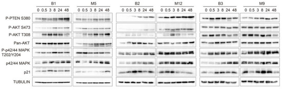 Effects of malignant pleural fluid (PF) on the phosphorylation of different proteins that participate in cell survival- and proliferation-related signaling pathways. Western blot images show whole protein lysates of MeT-5A cells treated with PF samples B1, M5, B2, M12, B3, and M9 for 0, 0.5, 3, 8, 24, and 48 h. The antibodies that were used recognized phosphatase and tensin homolog serine 380 (P-PTEN S380), phospho-AKT serine 473 (P-AKT S473), phospho-AKT threonine 308 (P-AKT T308), pan AKT, phospho-p42/44 MAPK threonine 202/tyrosine 204 (P-p42/44 MAPK T202/Y204), p42/44 MAPK, and p21. Tubulin was used as the control. The Western blots are shown in three panels: B1-M5, B2-M12, and B3-M9. Graphs showing band intensity quantification and the calculated phosphorylated/non-phosphorylated ratio for each protein are shown in Supplementary Figure S3. Abbreviations: B, benign; M, malignant.