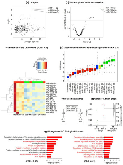 In our study, 4 of 12 MPE samples (M2, M10, M11, and M12) had negative cyto-histological pleural examination results, which risked the misclassification of these samples as being benign. However, with the application of the decision trees, all these samples were correctly identified as malignant. The Gene Ontology (GO) analysis showed that the significantly upregulated miRNAs were enriched in several biological processes (Figure 4g). We found 42 significantly associated processes with an FDR < 0.05 and plotted the 10 most relevant processes in Figure 4g.