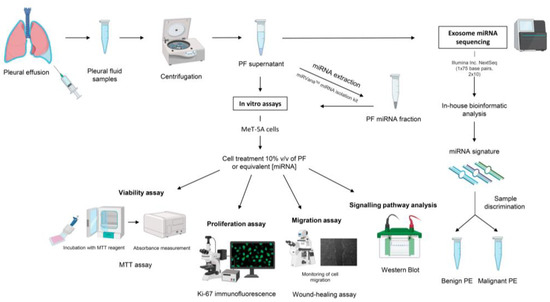 One limitation of this study is the relatively low number of PF samples that were used for miRNA profile mapping. However, despite having a limited sample size, we were able to identify a miRNA signature that discriminated between benign and malignant conditions. This, together with the in vitro experiments, helped us to better understand the biological effects (e.g., proliferation and migration) exerted by PF and the miRNAs they contain on normal mesothelial MeT-5A cells. Another limitation was the impossibility of studying the significance of all potential PF biomarkers, such as carbohydrates, proteins, lipids, DNA, metabolites, or other RNA species, some of which may also play a role in MPE initiation.