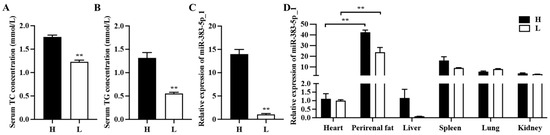 miR-383-5p_1 is associated with adipose development. (A,B) TG and TC content in light (L) and heavy (H) rabbits. (C) The expression of miR-383-5p_1 in perirenal adipose tissue of light and heavy rabbits. (D) Expression of miR-383-5p_1 in light and heavy rabbit tissues. Data are expressed as means ± SEM. ** p < 0.01.