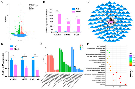 Analysis of differentially expressed genes. (A) The volcano plot was constructed for the differentially expressed genes based on log2 (fold change) and −log10 (p-value). (B) Validation of differentially expressed genes. (C) The intersection target genes of miR-383-5p predicted by miRanda, TargetScan, and RNAhybrid software. (D) CNIH4, NUF2, and RAD51AP1 levels after transfecting with the miR-383-5p mimic and NC 24 h. (E) GO analysis of the differentially expressed genes were performed, imaging only those terms that were significantly enriched in the BP, CC, and MF categories. (F) KEGG analysis of the differentially expressed genes only listed significant enrichment pathways. The data are presented as means ± SEM. * p < 0.05; ** p < 0.01.